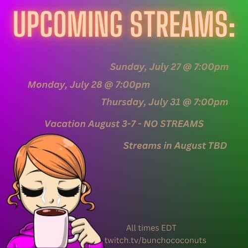 Hello Reader! I'm so glad you're here! Life update for Java and I: We are downsizing and moving sometime within the next month or so. We are also on vacation the first week of August. The plan is to continue streaming until we finish Alien: Isolation, and then take a break from streaming until after the move. As always, any changes to this schedule will be posted in Discord. Links and things: Twitch YouTube Twitter Discord Stream Game Fund I hope to see you in the stream! 600 1st Ave, Ste 330...